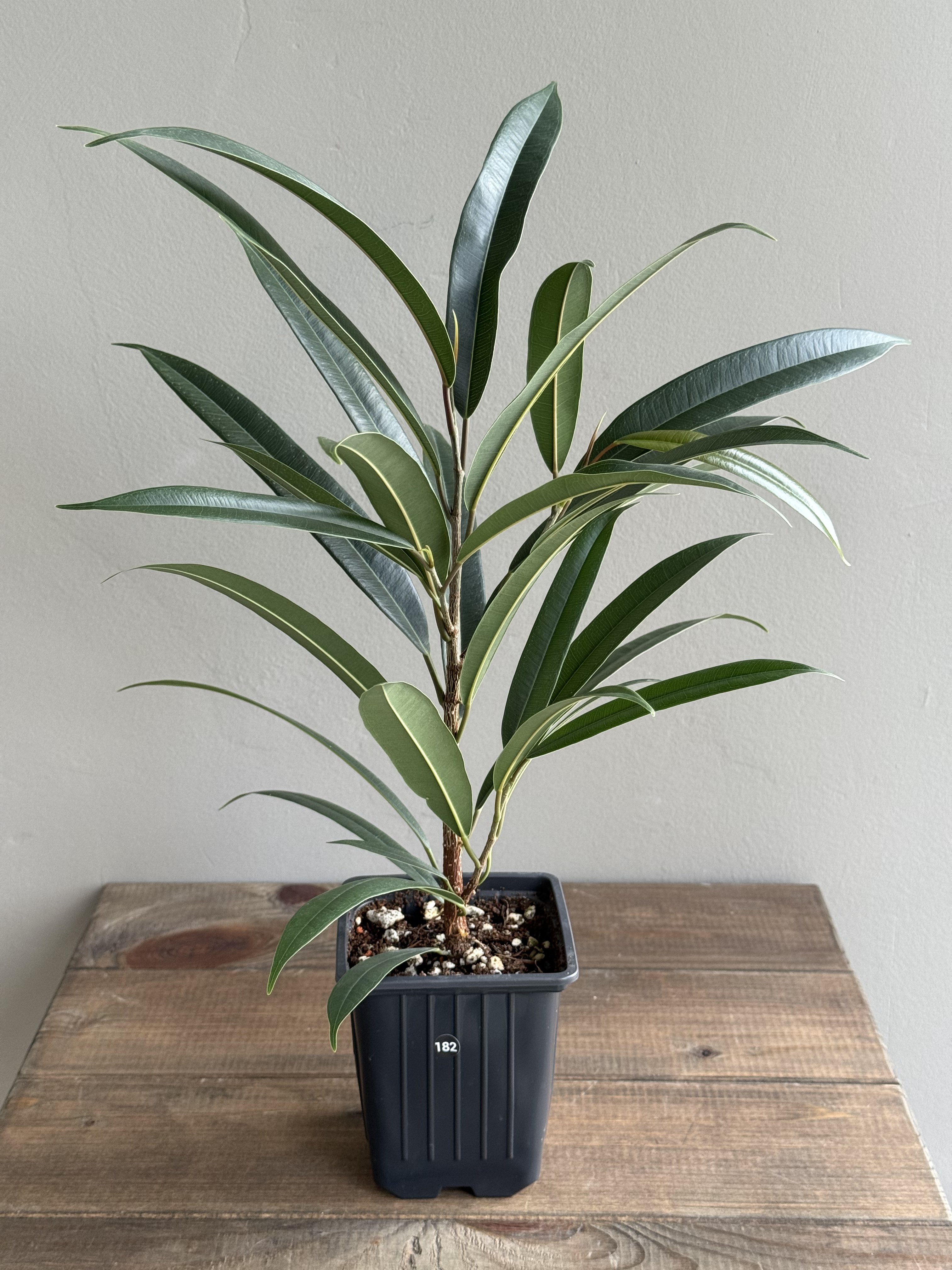 Амстел Кинг вырастает до 2 метров в высоту. Ствол тонкий, коричневый. Листья мясистые, узкие и длинные, напоминают листву ивы. Листовая пластина темно-зеленого цвета. Теневыносливый сорт, хорошо адаптируется к низкой влажности.