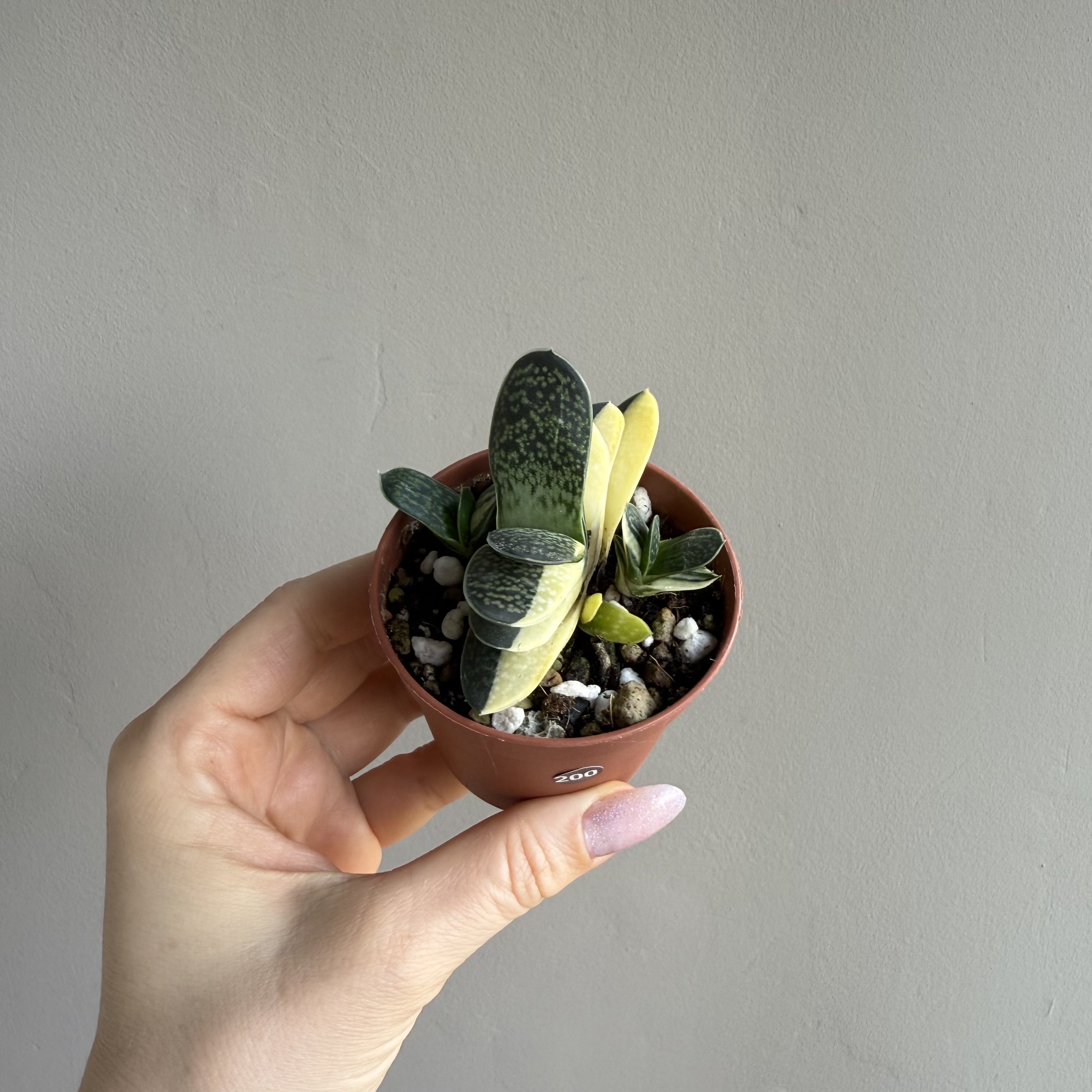 Гастерия Веррукоза или Гастерия бородавчатая в благоприятных условиях может вырасти до 30 сантиметров в диаметре. Листья мясистые, овальной формы, могут вырастать до 20 сантиметров в длину. Листья растут друг напротив друга, таким образом, формируется розетка из двух рядов. Листовая пластина зеленая, с желтыми или кремовыми полосками разной ширины. Особенность этого растения – бугорки, напоминающие бородавки, которые покрывают листья.