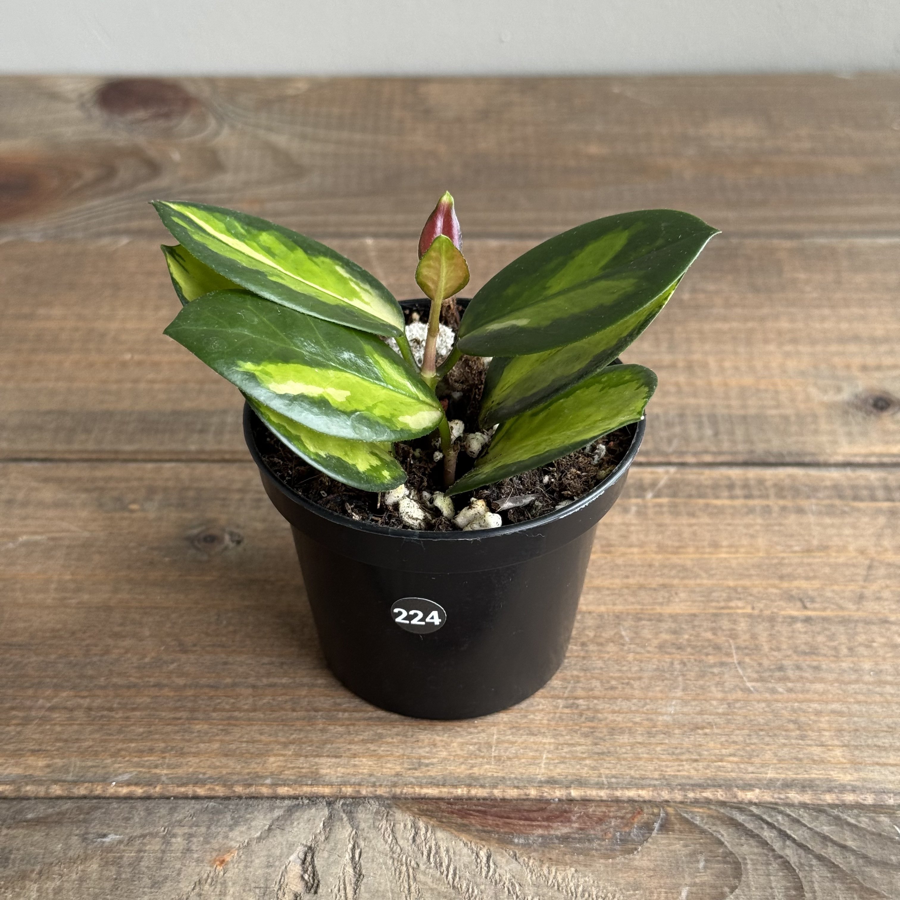 Крупный сорт с овальными листьями. Мясистая листовая пластина темно-зеленая по краям покрыта светло-зелеными и желтыми пятнами. Чем больше света получает растение, тем контрастнее и ярче листья. Цветы от бледно-розовых до пурпурных.