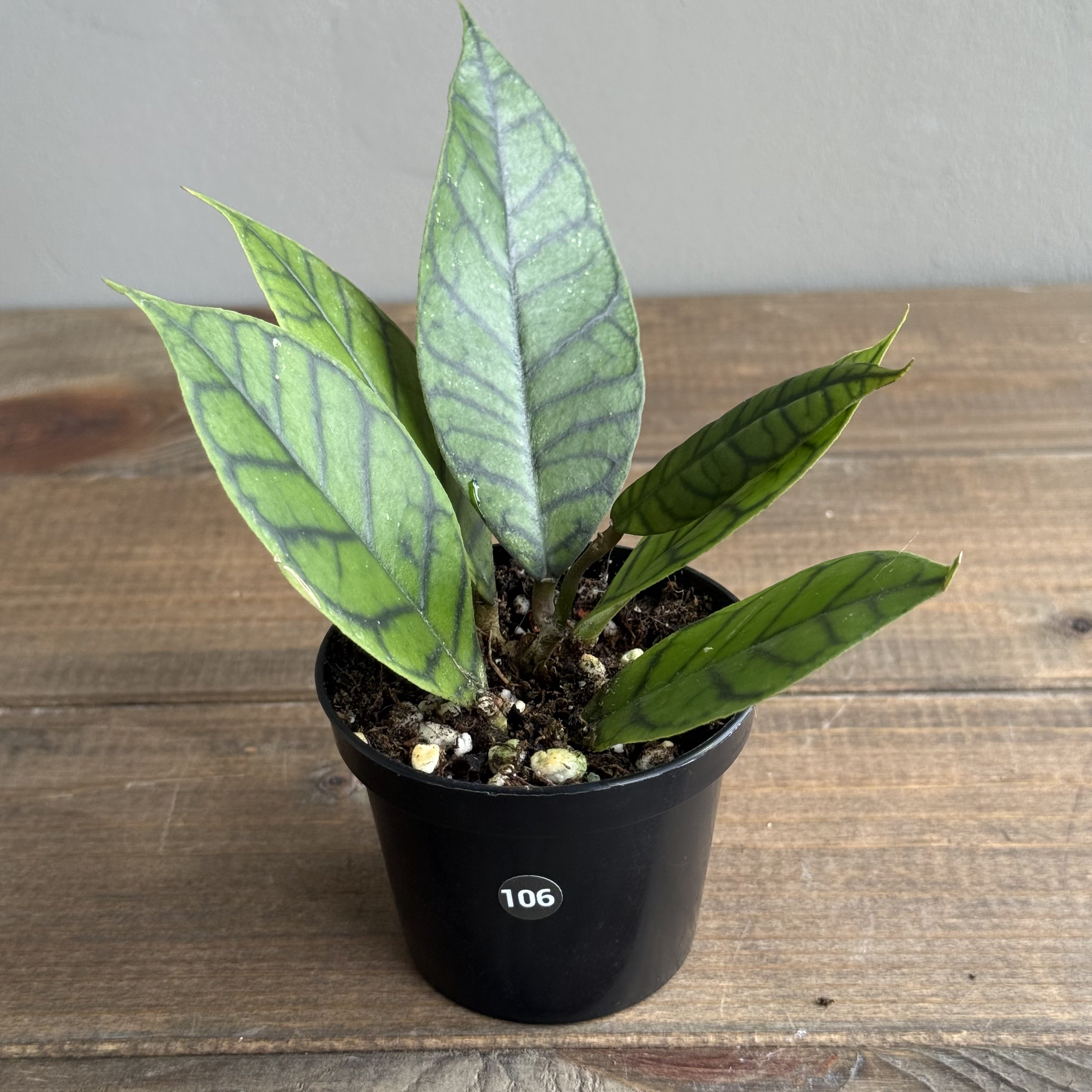 Этот вид отличается необычными вытянутыми листьями с острыми кончиками. На светло-зеленой листовой пластине выделяются темные прожилки, делая лист похожим на маленького крокодильчика. Молодые листья – бронзовые. Цветы желтоватые с розовым центром.