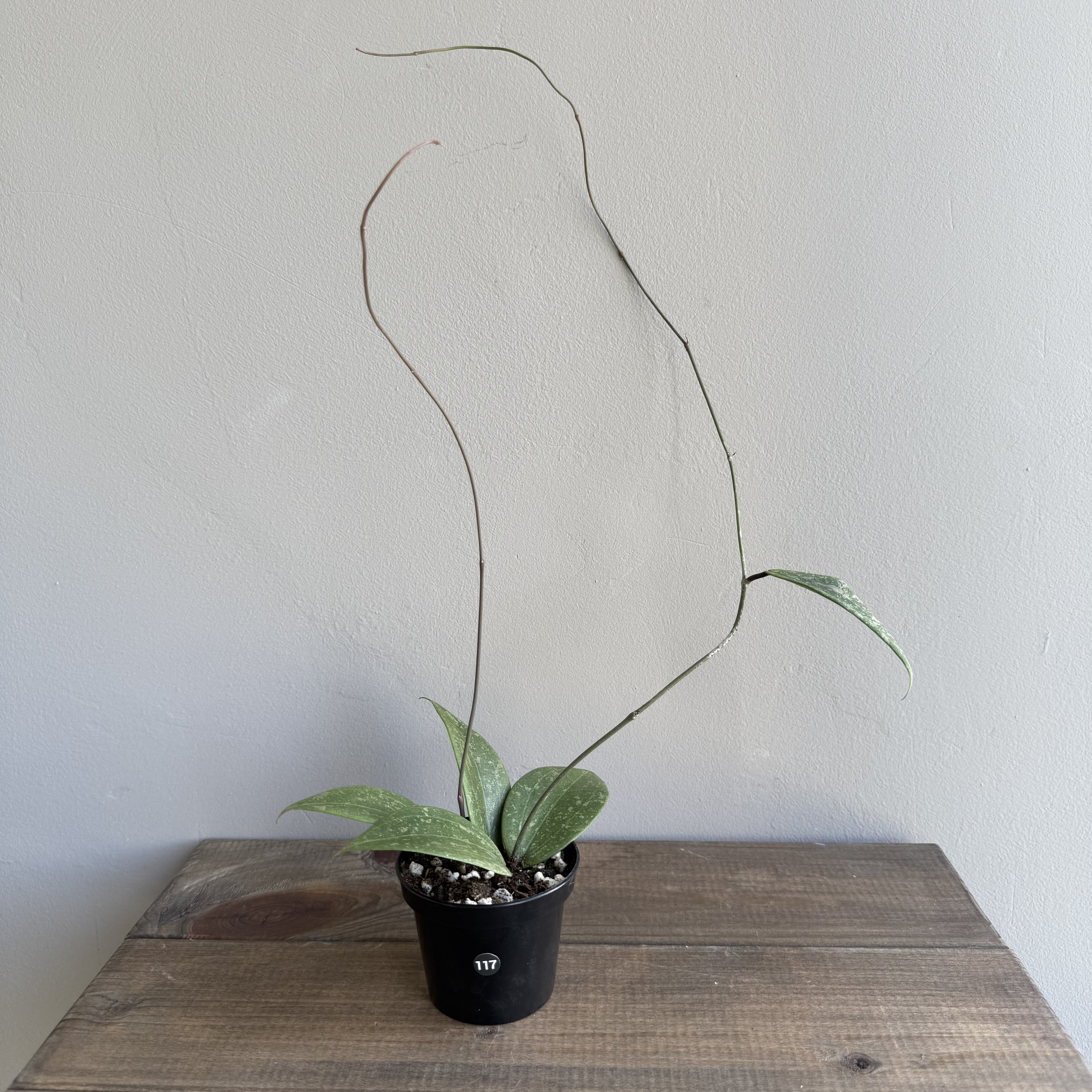 Листья этого вида имеют овальную форму с острым кончиком, 6-8 сантиметров в длину и 3-4 сантиметра в ширину. Листовая пластина зеленая, покрыта серебряными пятнами с розовым оттенком. На листе выделяется центральная и две симметрично расположенные продольные жилки, что делает лист рельефным. Цветы кремовые, с желто-розовым центром.