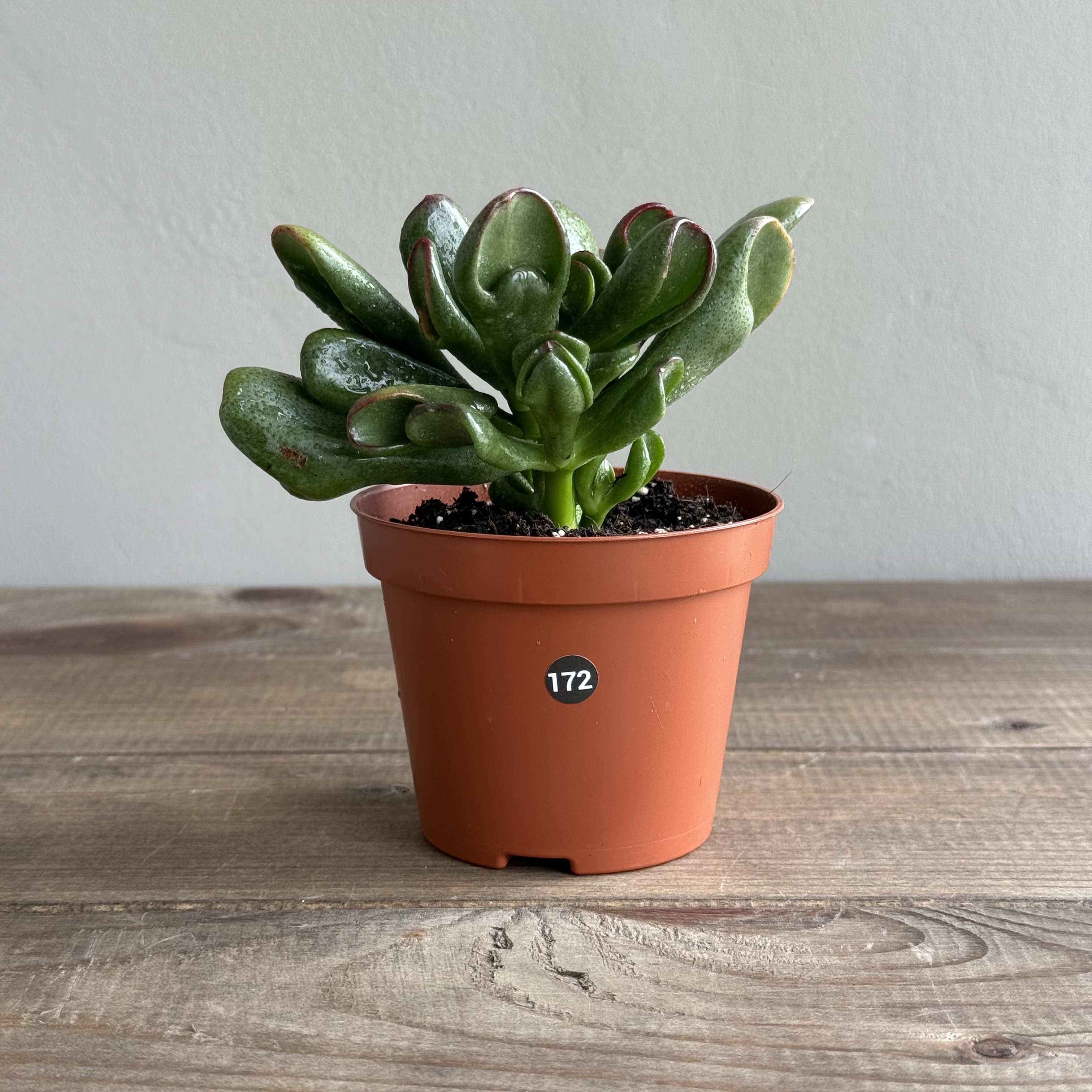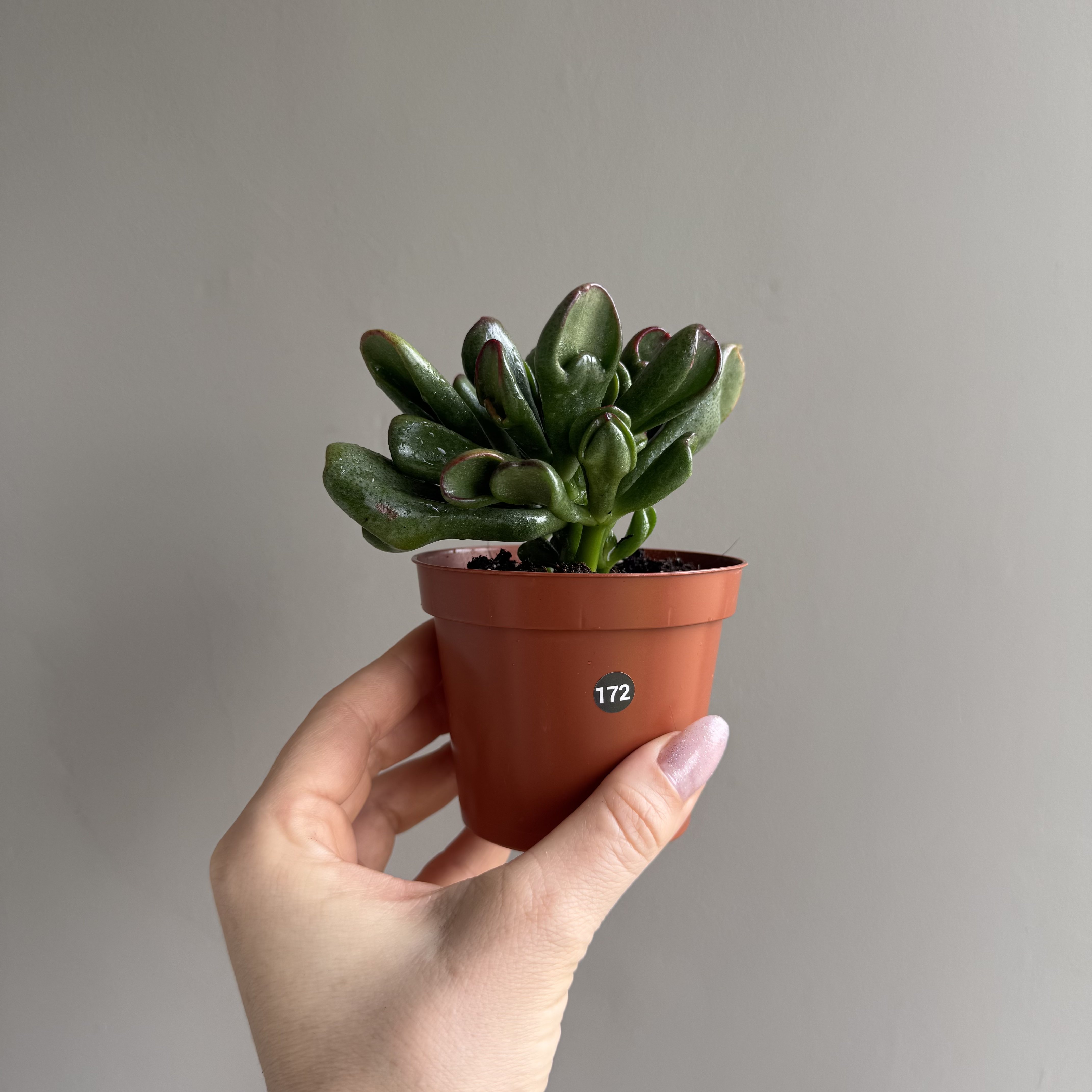 Сорт, выведенный на основе крассулы оваты. В благоприятных условиях может вырасти до 30 сантиметров в высоту, хорошо ветвится. Мясистые листья имеют необычную форму воронки, они узкие у черенка и расширяющиеся к концу. Листовая пластина зеленая, с красноватой каймой.