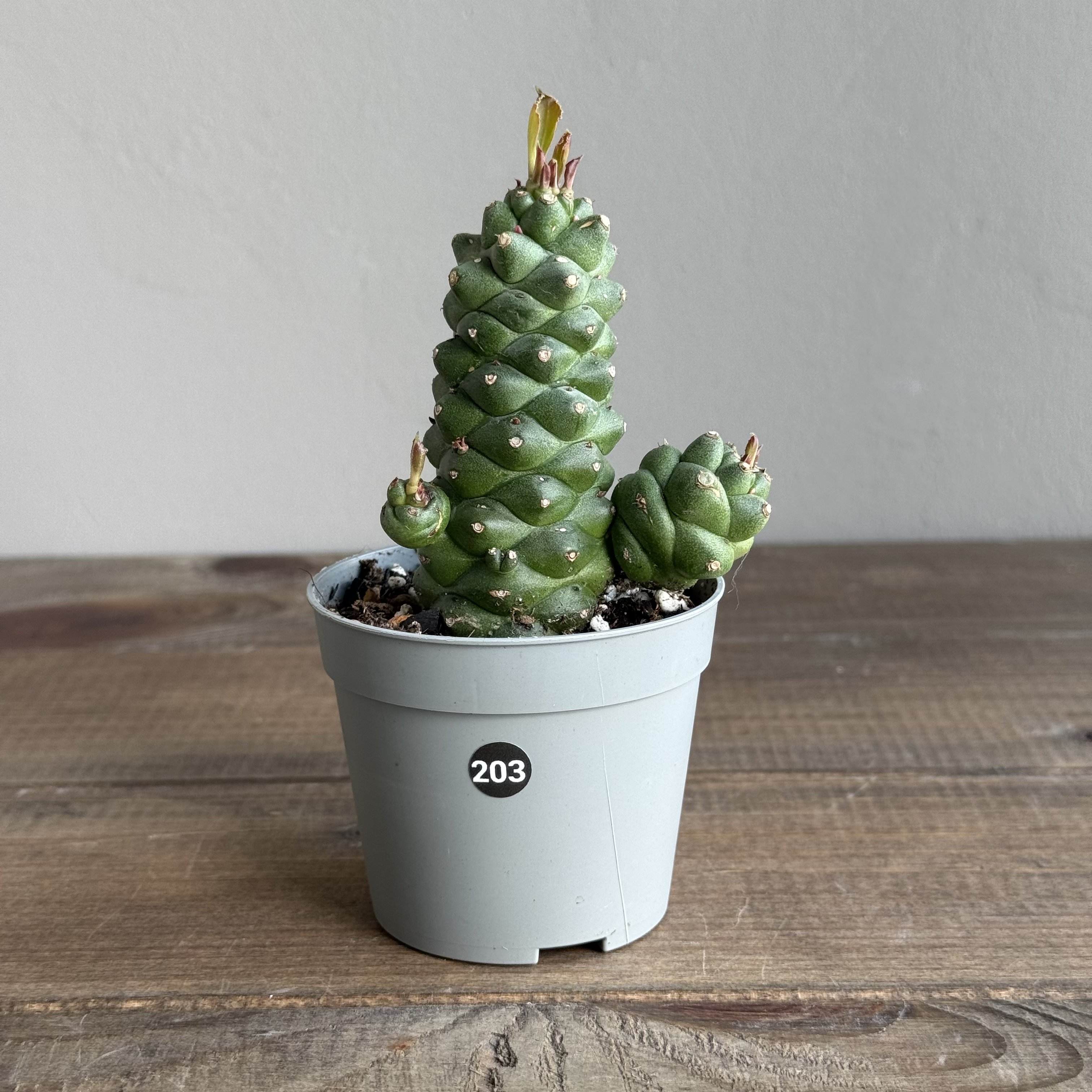 Суккулент с толстым мясистым стволом. Ствол состоит из выпуклых сегментов с колючкой в центре. Листья ложковидные, вытянутые, расположены, как правило, на верхушке ствола. В условиях засухи растение может сбросить все листья.