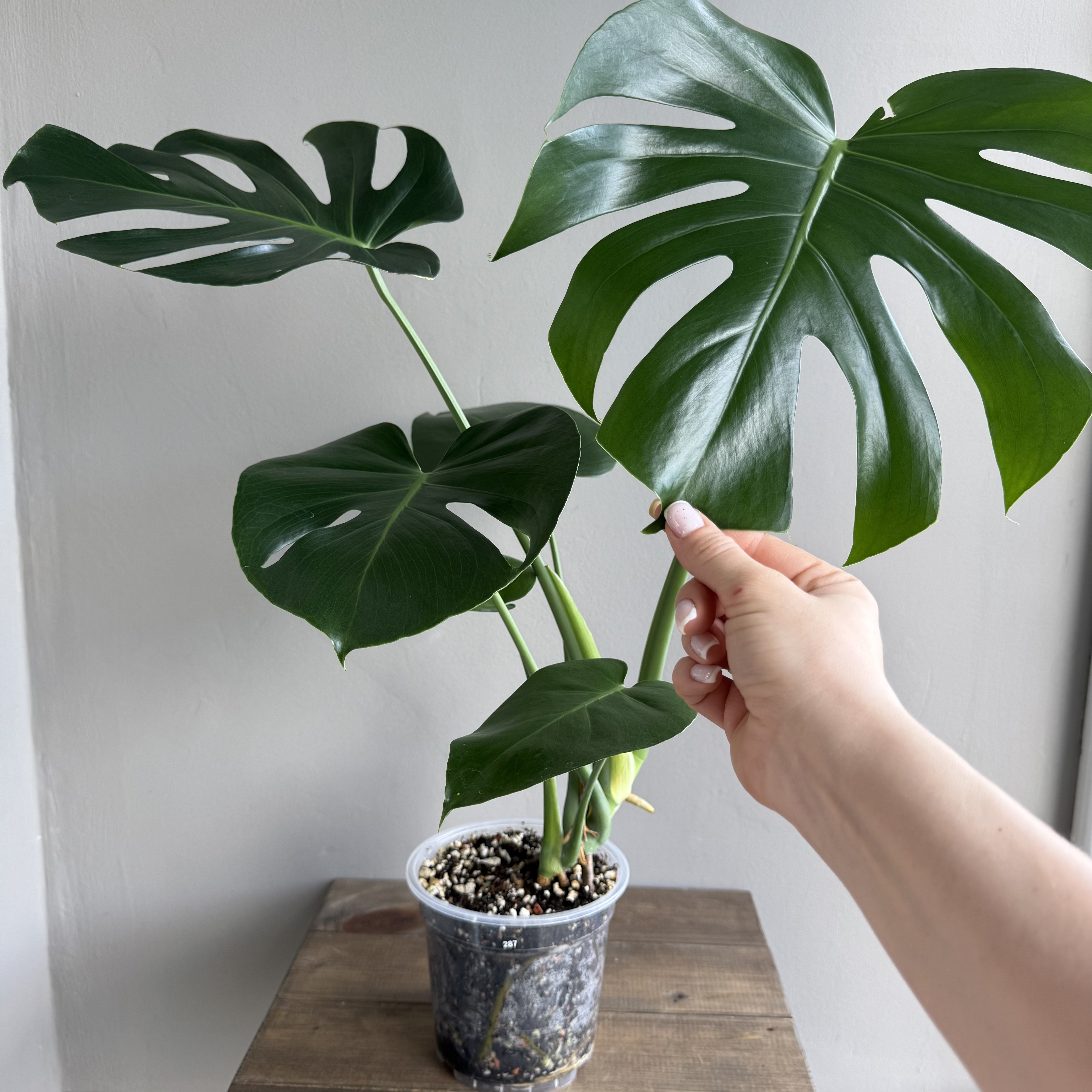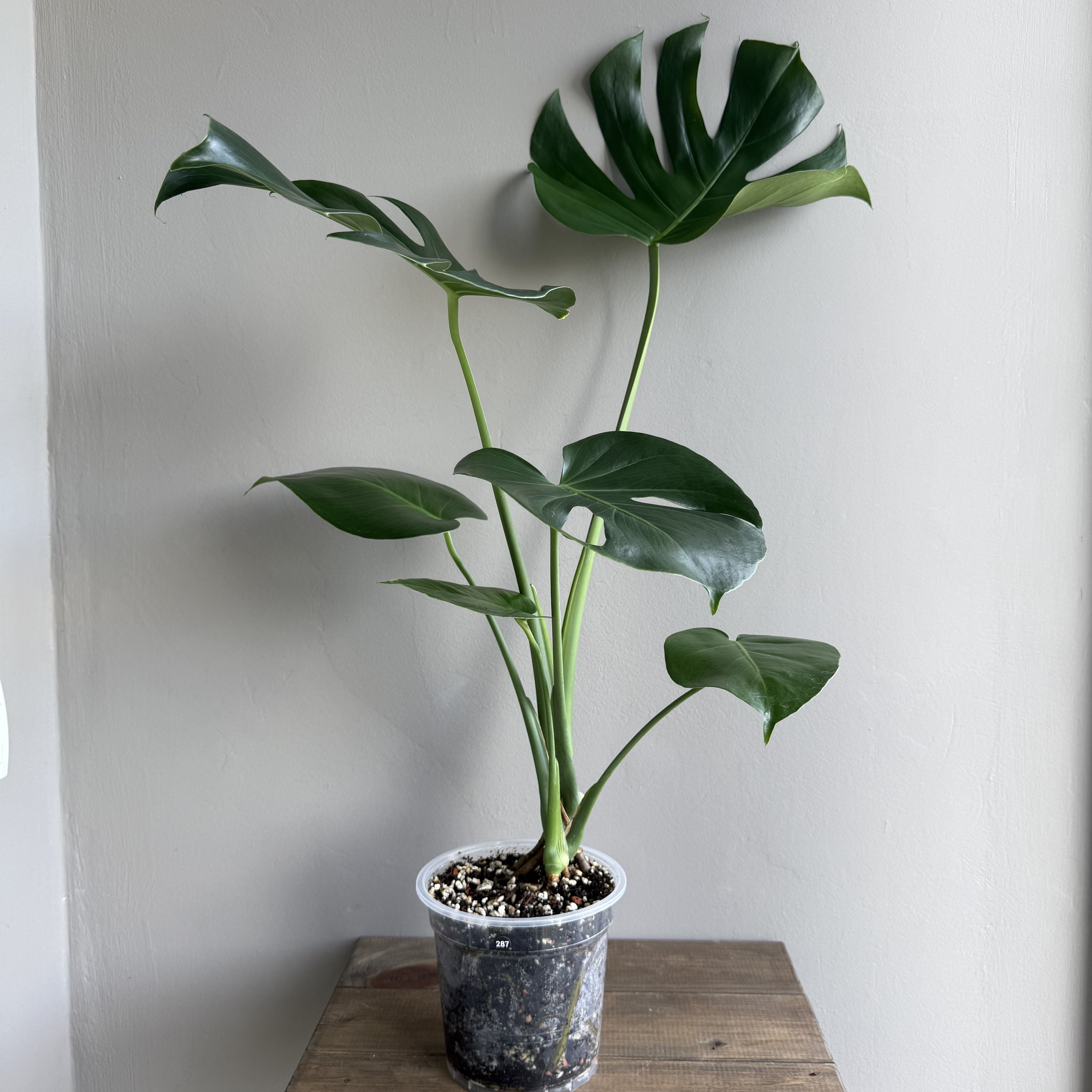 Крупная лиана, вырастает до 10 метров в длину. Листья сердцевидной формы могут достигать метра в длину и 70 сантиметров в ширину. Листовая пластина взрослого растения имеет прорези. Растение формирует длинные воздушные корни, которые, попадая в грунт, становятся полноценными корнями. Самый распространенный вид монстеры.